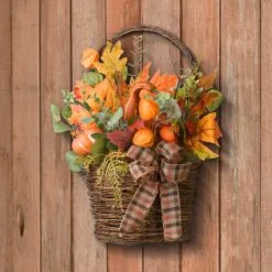 National Tree Company Artificial Flowers In Wicker Basket, Decorated With Pumpkins, Gourds, Flower Buds, Burlap Bows, Maple Leaves, Autumn Collection, 17 In