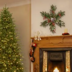 National Tree Company Pre-Lit Artificial Christmas Hanging Snowflake, Green, Frosted Berry Pine, Decorated With Pine Cones, Berry Clusters, Frosted Branches, Christmas Collection, 32 Inches