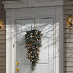 National Tree Company Pre-Lit Artificial Christmas Teardrop, Green, Colonial Fir, White Lights, Decorated With Pine Cones, Flowers, Frosted Branches, Christmas Collection, 32 Inches