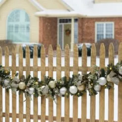 National Tree Company Pre Lit Artificial Garland, Yuletide Glam, Green, Decorated With Gold And Silver Ball Ornaments, Golden Bows, Warm White LED Lights, Battery Powered, Christmas Collection, 9 Feet