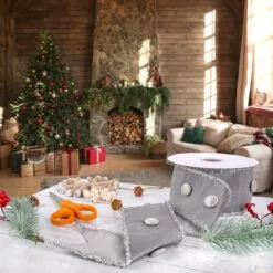 National Tree Company 3″ HGTV Home Collection Dupioni Button Ribbon, Silver