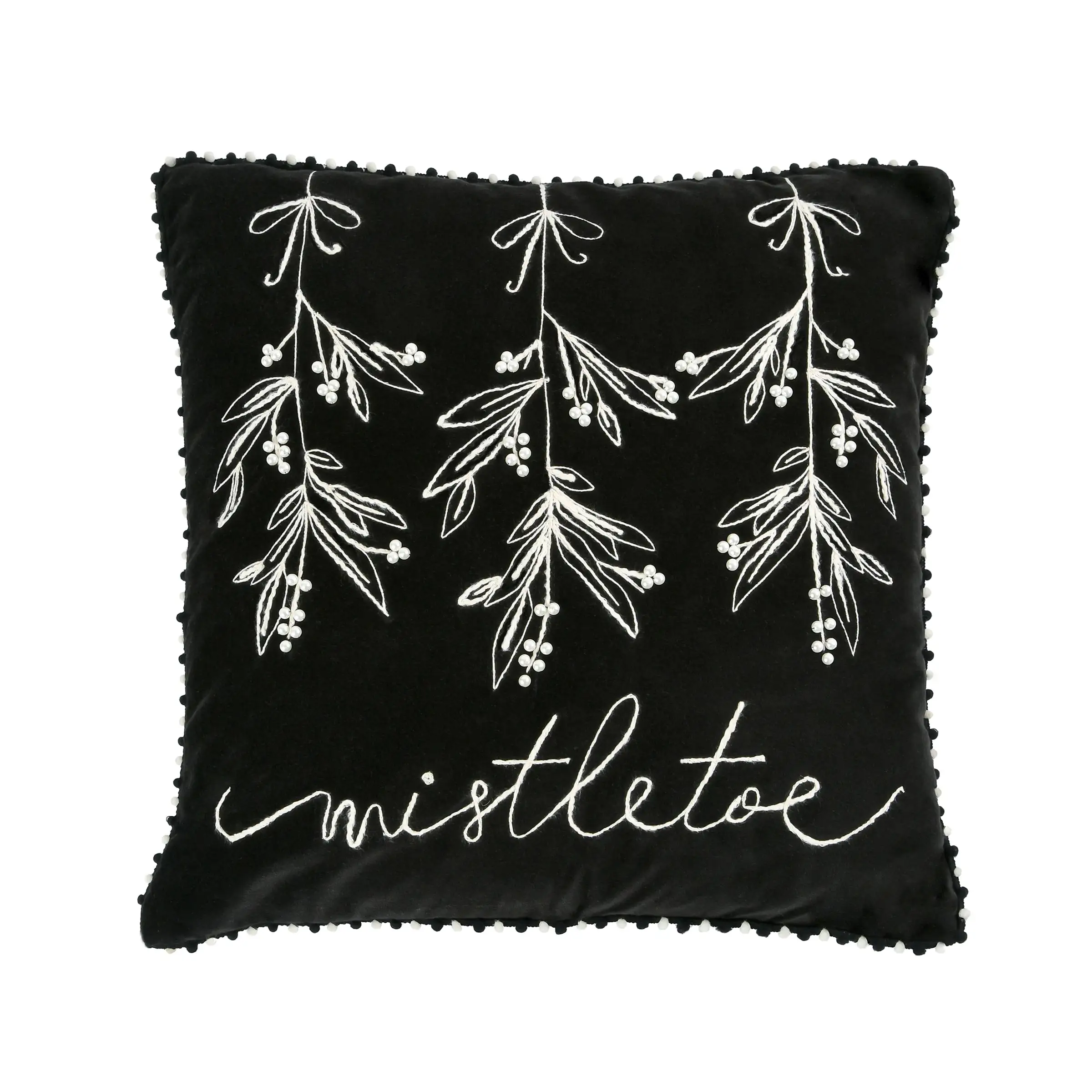 This deep black velvet pillow features bright white embroidered drawings of three mistletoe flowers with pearl bead berries hanging above the word ‘mistletoe” lettered in a flowing script. Smooth and soft, this furniture accent is made with a durable olefin outer shell and supportive polyester fill with a decorative piping edge. Back side of pillow is solid black. Add a touch of warmth and whimsy to your holiday decorating scheme with this comfy cushion.