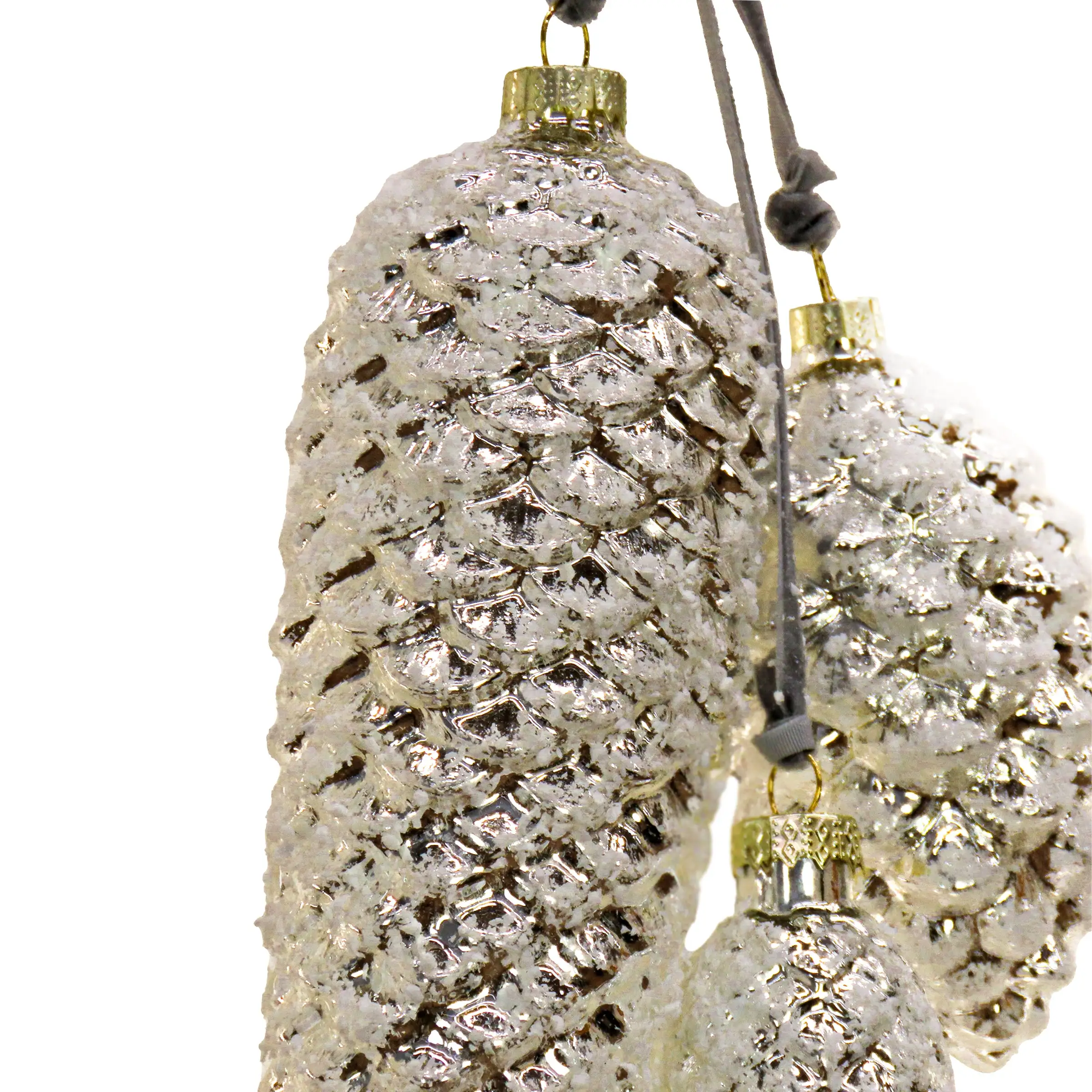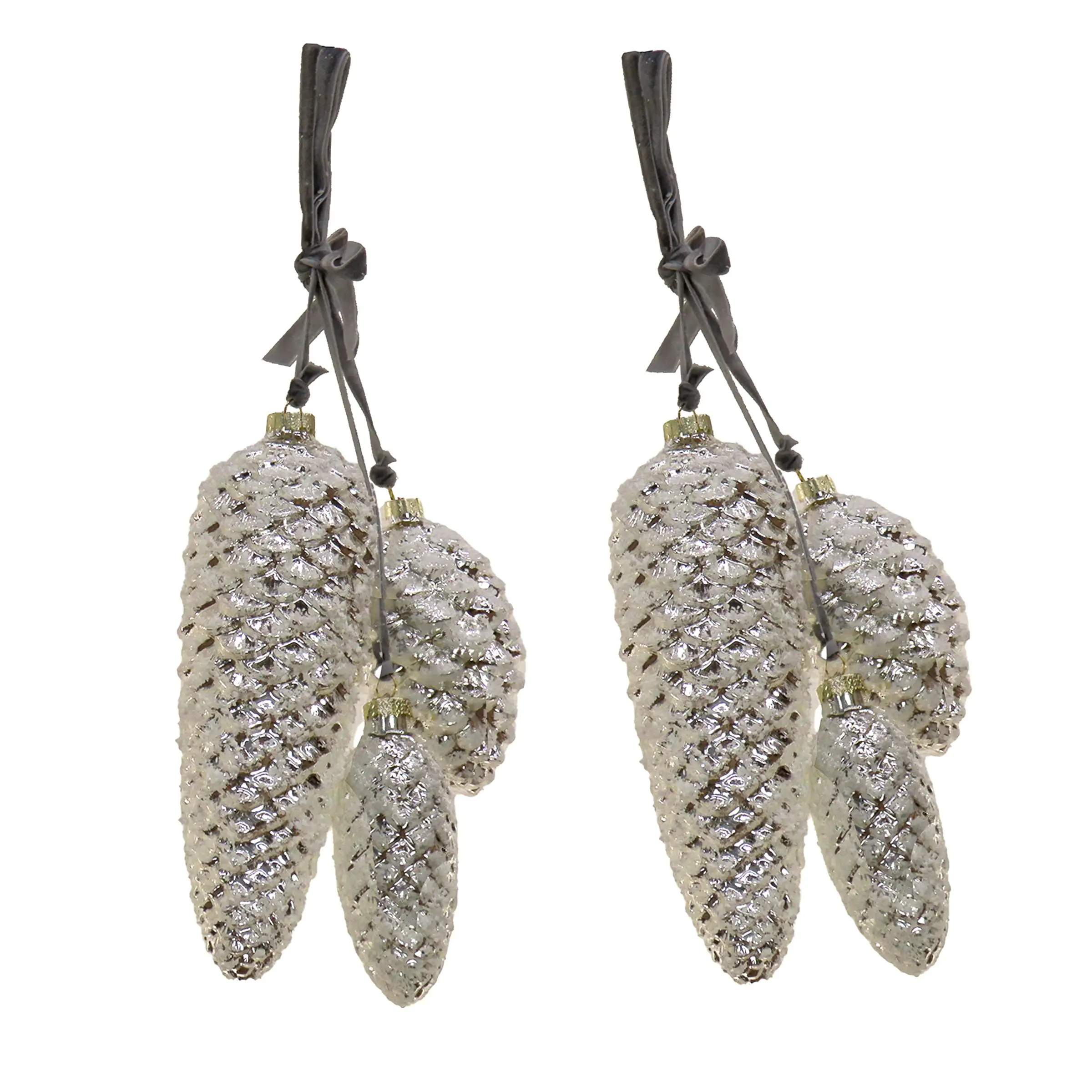 This set consists of two 3-piece clusters of pinecones in varying shapes and sizes. All of these handcrafted pinecones are constructed of glass and feature a snow-dusted sparkling silver finish. Each group of ornaments is tied together with ribbon to a main hanging loop. These unique decorations will add a little more sparkle to your holiday tree trimming.