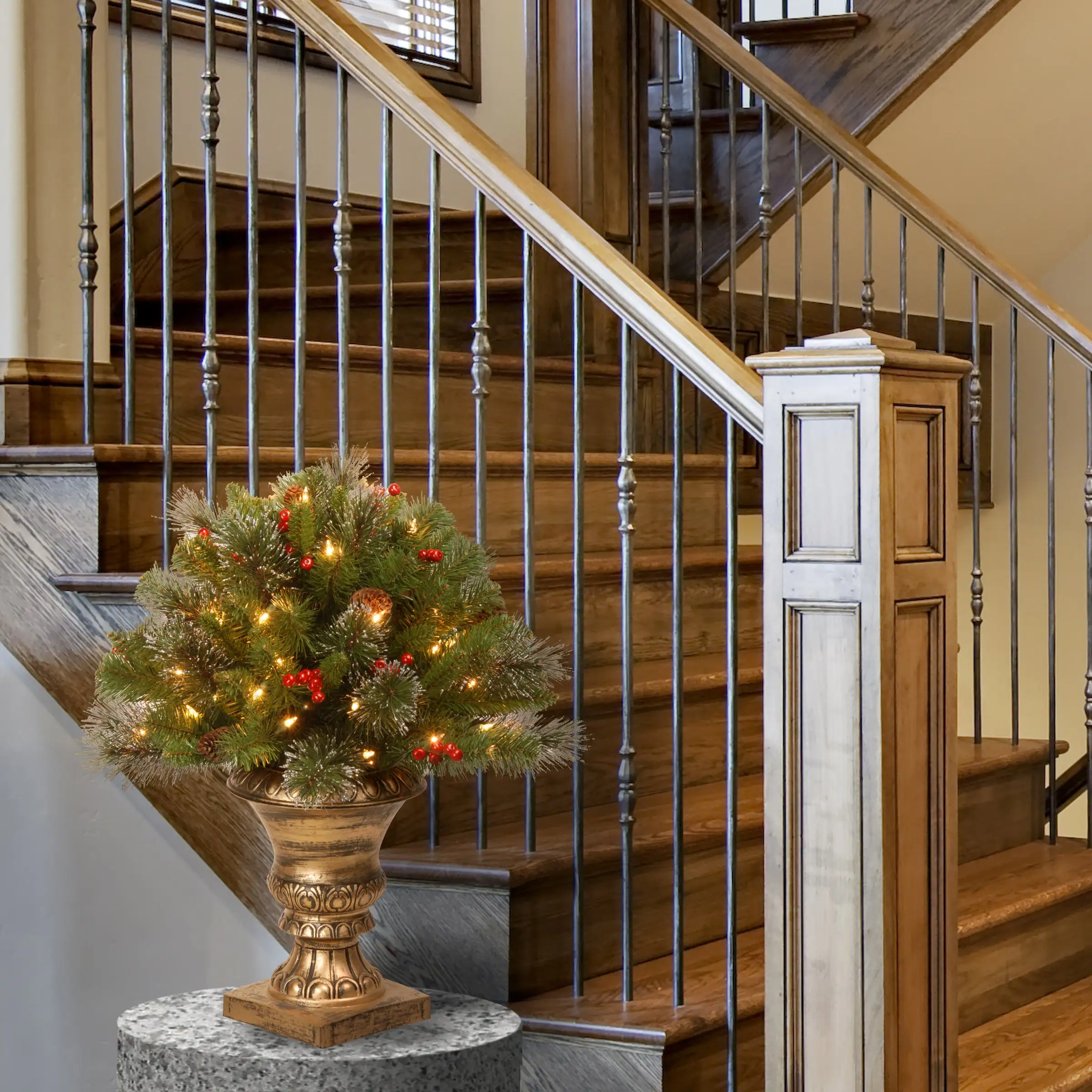 This Crestwood Spruce Porch Bush is a welcoming addition to doorway, deck, porch or patio. Trimmed with silver bristle, pine cones, red berries and glitter, this potted bush is pre-lit with 35 clear lights that remain lit even if a bulb burns out. Display this attractive greenery in any indoor or covered outdoor location.