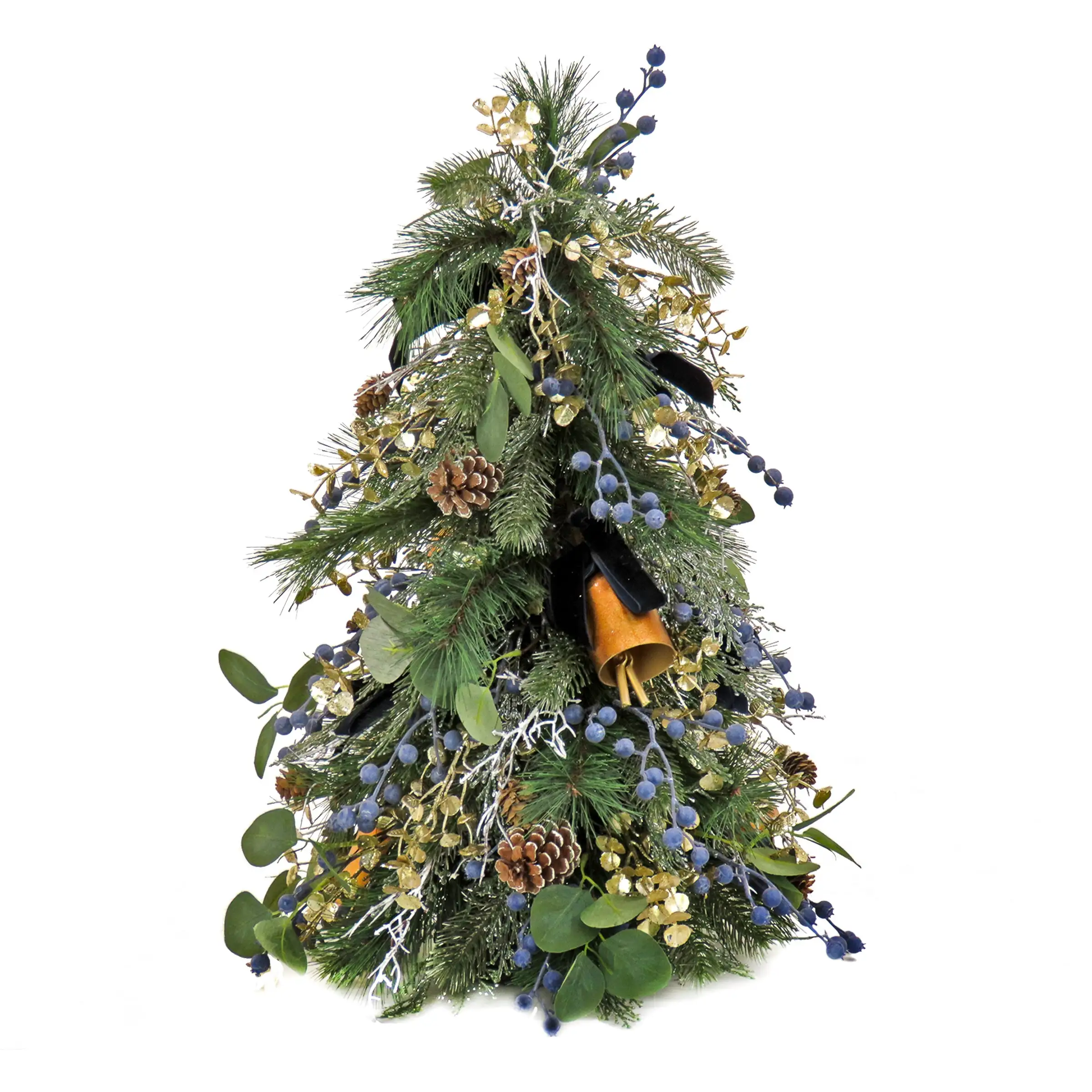 This Swiss Chic decorated topiary tree features a mixture of evergreen and bristle branch tips creating a unique holiday décor piece. It is trimmed with pinecones, white twigs, clusters of blue berries and gold metal bells tied with black lace ribbons. Display this festive tree on floor or tabletop for added holiday cheer. Indoor use only.