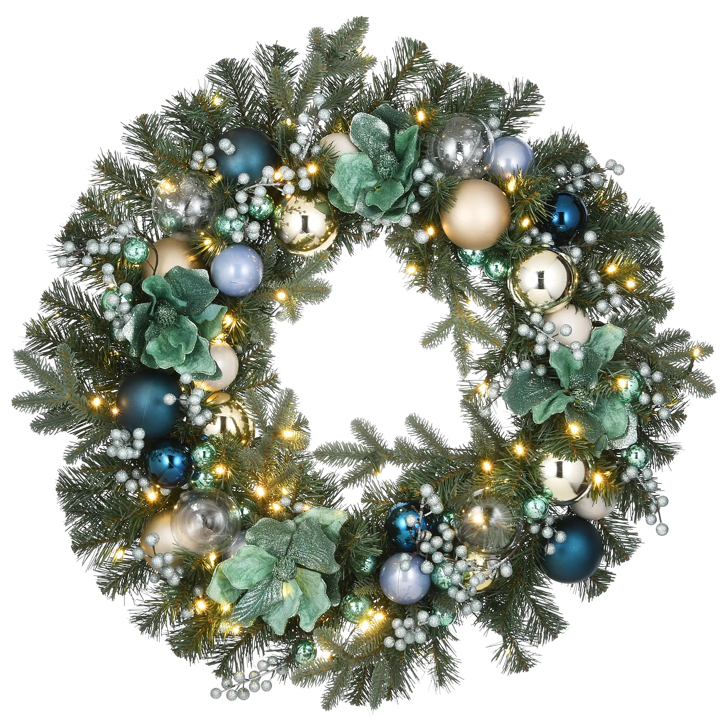 This decorated evergreen wreath features sparkling purple, blue and pastel accented trimmings that include flower blooms, berry clusters, and ball ornaments. It is pre-strung with 100 battery-operated warm white LED lights that are energy-efficient and long lasting. Included is an option for 6 hours ON/18 hours OFF timed operation. Also included is a convenient handheld remote to control the lights. This attractive holiday wreath can be displayed on doors, walls, and windows in indoor or covered outdoor locations.