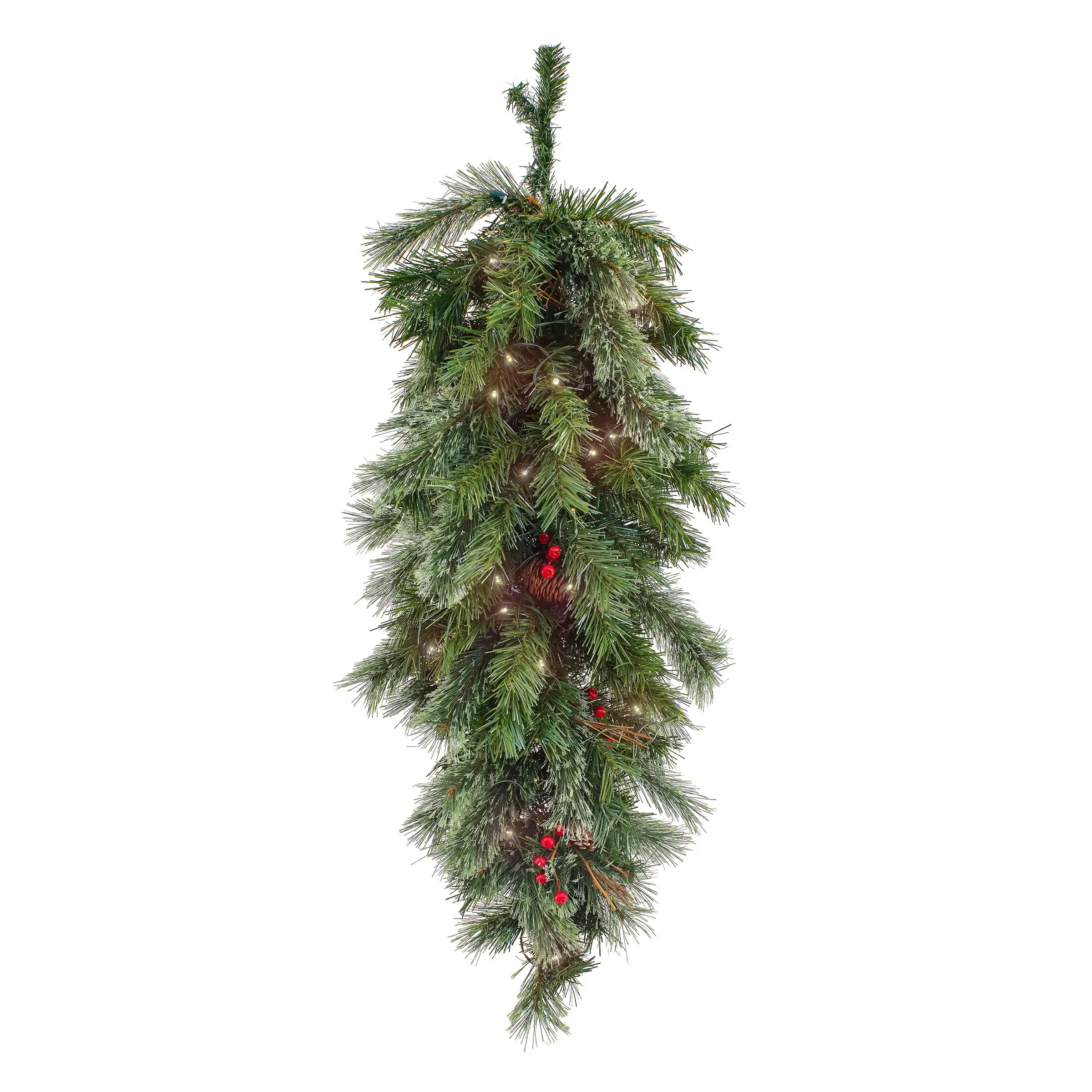 This Glistening Pine teardrop features mixed branch tips and is trimmed with red berries and pinecones for added natural appeal. It is pre-strung with 50 battery-operated warm white LED lights that are energy-efficient and long lasting. A 6 hours ON/18 ho