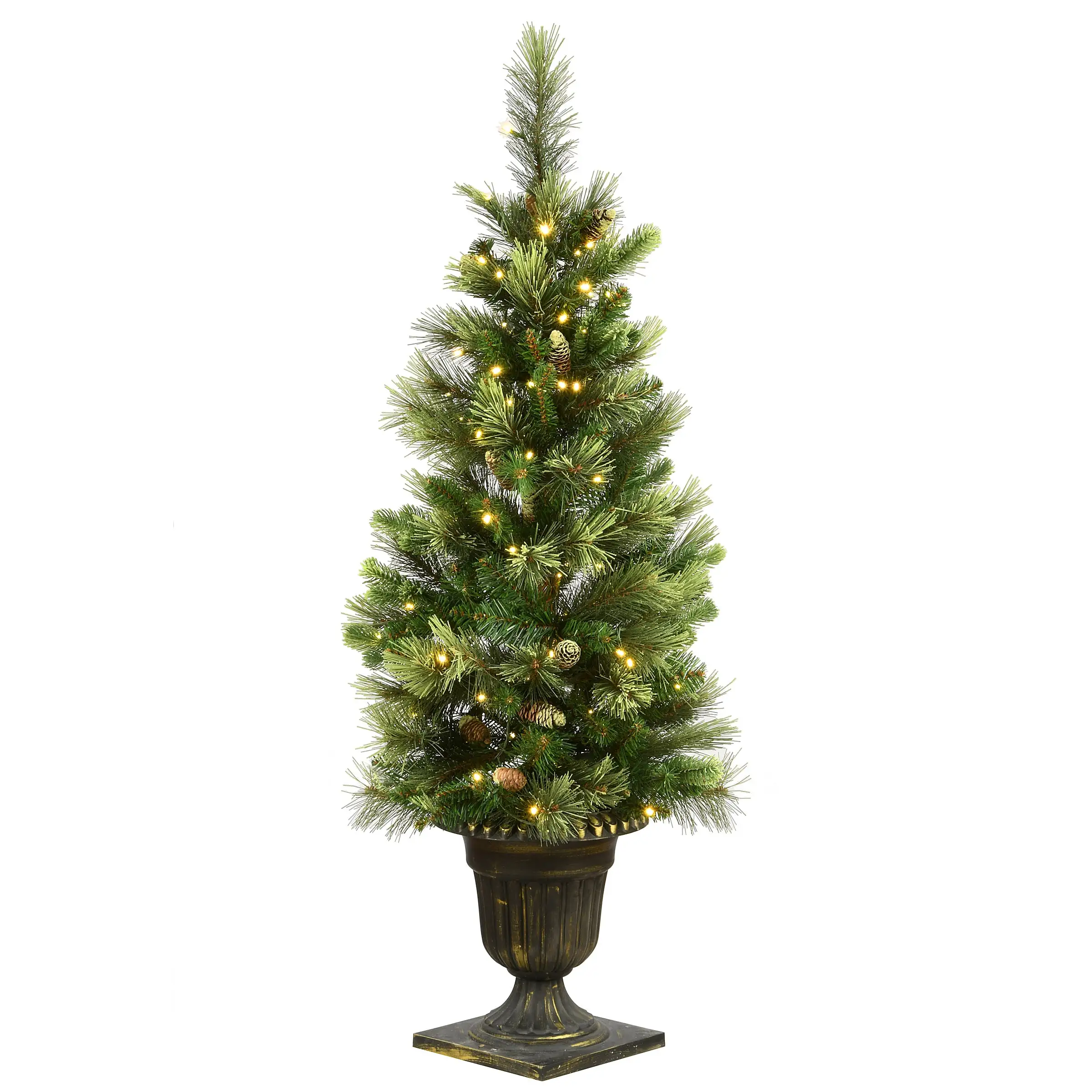 This Carolina Pine Entrance Tree is a welcoming addition to doorway, deck, porch or patio. Featuring mixed branch tips with bristle, it is trimmed with flocked pinecones for added appeal. Seated in a decorative urn base, this tree is pre-lit with 100 battery-operated warm white LED lights and includes 6 hours ON/18 hours OFF timed operation. Display this attractive greenery in any indoor or covered outdoor location.