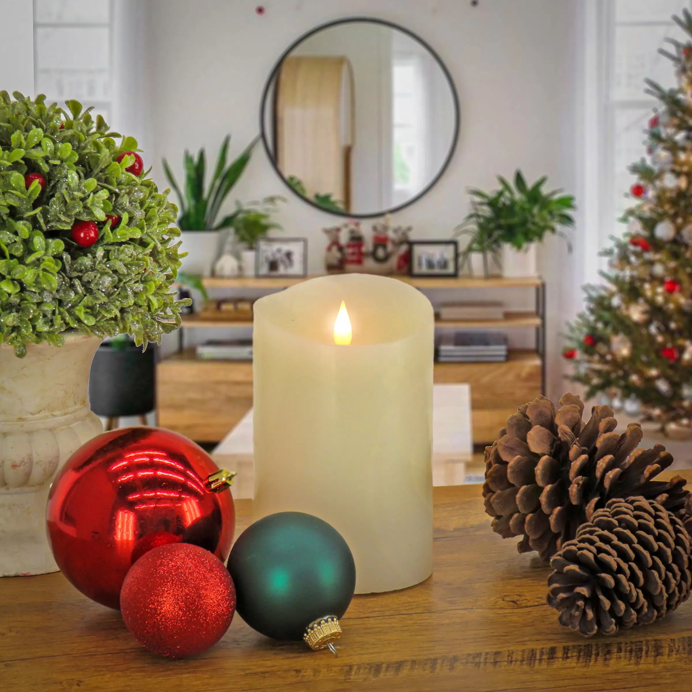 Battery operated with remote controlled functions, this flameless candle produces a realistic, soft, and safe candle glow. The smooth, ivory color exterior surface is crafted with real wax and features an uneven ‘melted’ top appearance. A handheld remote control operates the lifelike candle flame with functions that include brightness, flicker speed, and timer settings. Uses two C size batteries (not included).