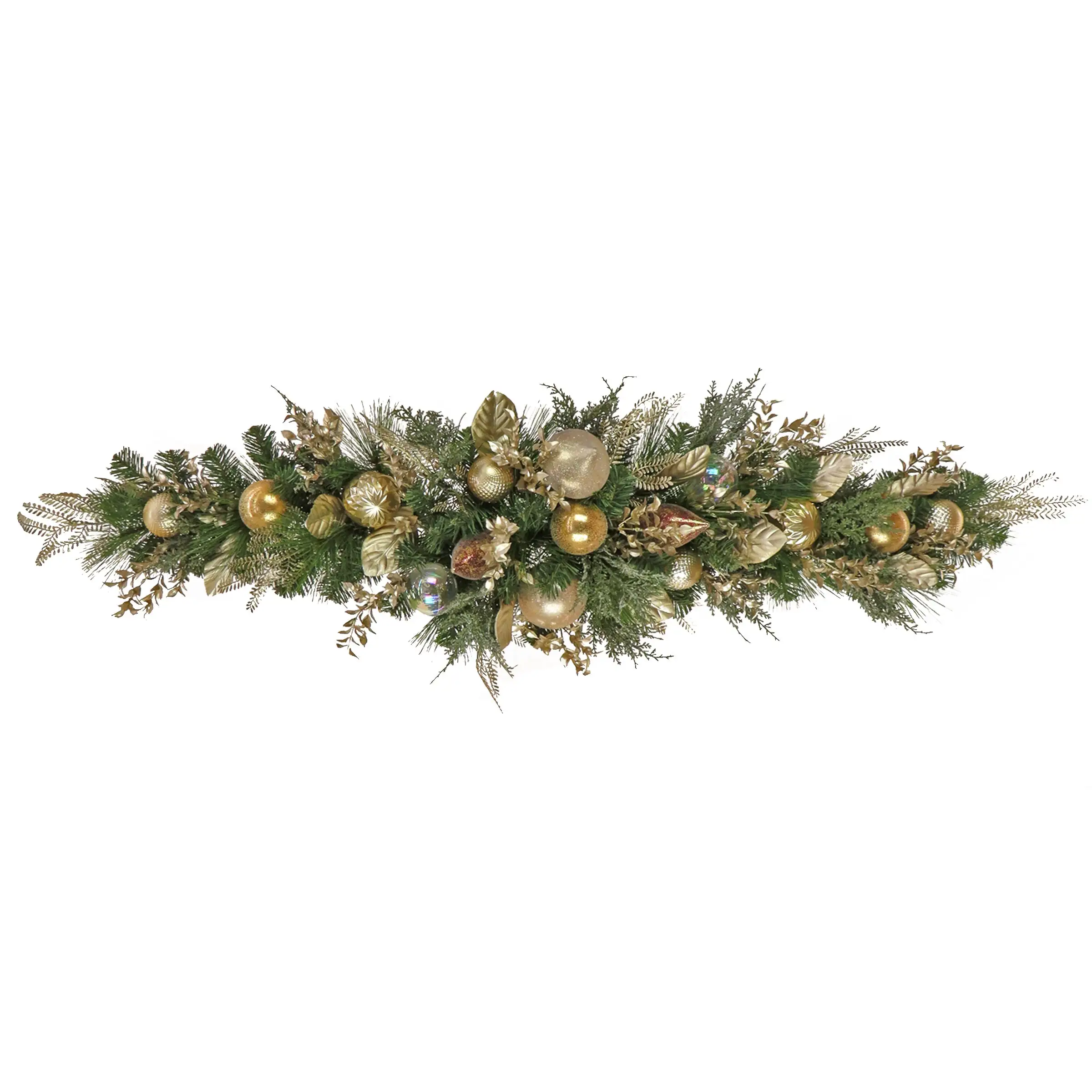 This Champagne Wishes decorated swag features a mixture of evergreen and bristle branch tips with delicate fern fronds all tightly grouped together to form this holiday décor piece. It is trimmed with golden leaves, long stem sprouts and ornaments in assorted styles colors and textures. Display this festive swag over a fireplace mantle or on a tabletop. For indoor use only.