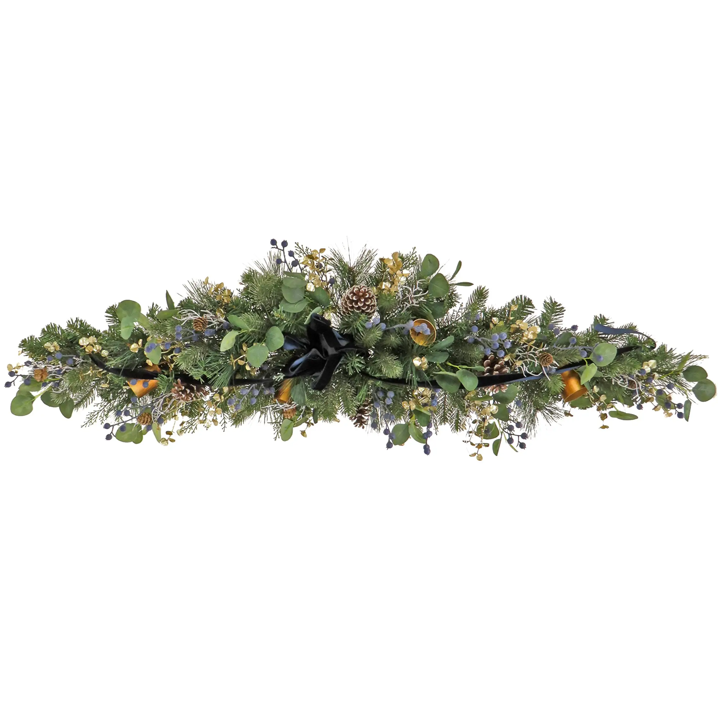 This Swiss Chic decorated mantle swag features a mixture of evergreen and bristle branch tips tightly grouped together to form this holiday dƩcor piece. It is trimmed with pinecones, leafy greens, white twigs, clusters of blue berries and gold metal bells. A black velvet ribbon and bow add the finishing touch. Display this festive swag over a fireplace mantle or on a tabletop. For indoor use only.