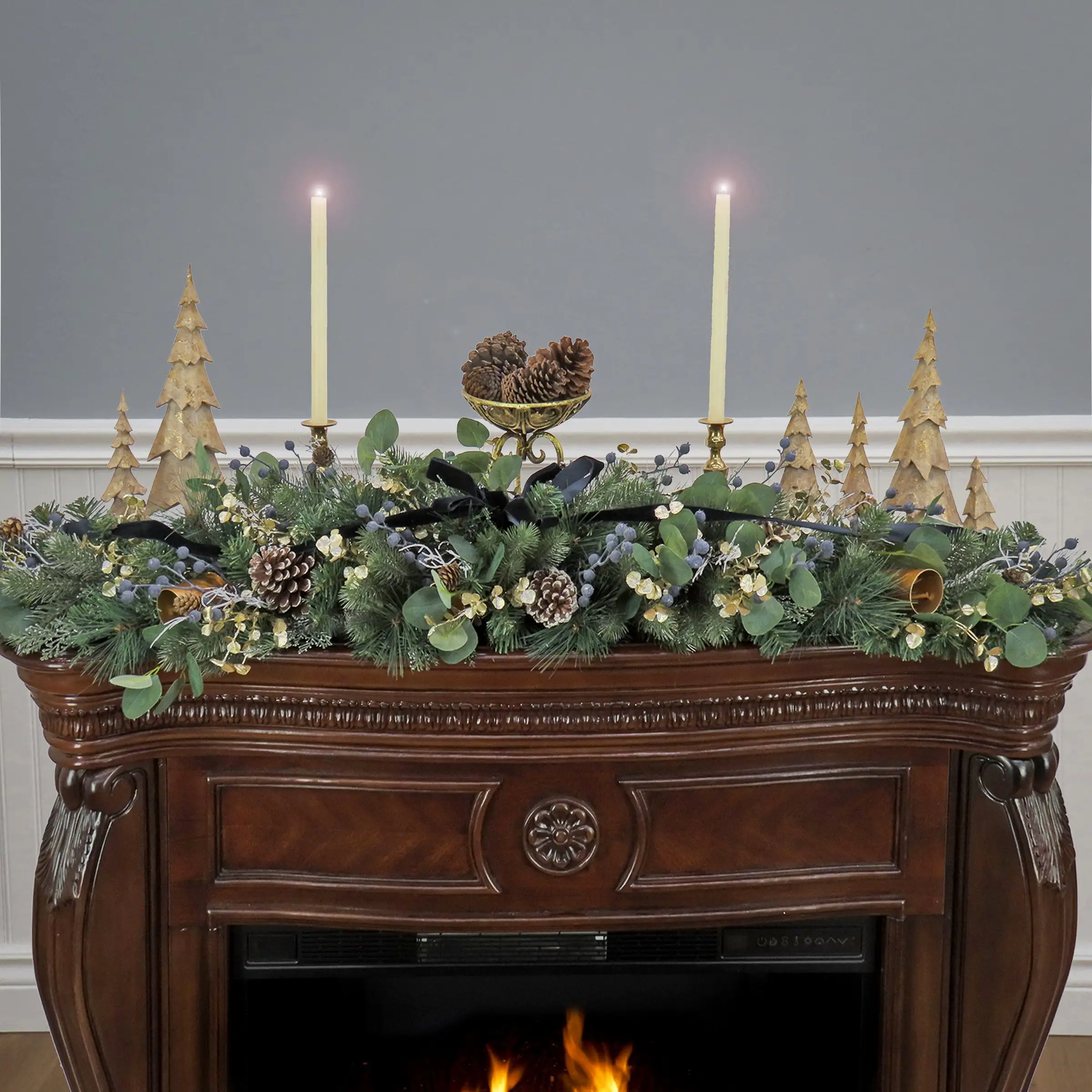- Trimmed with pinecones, berries, and bells