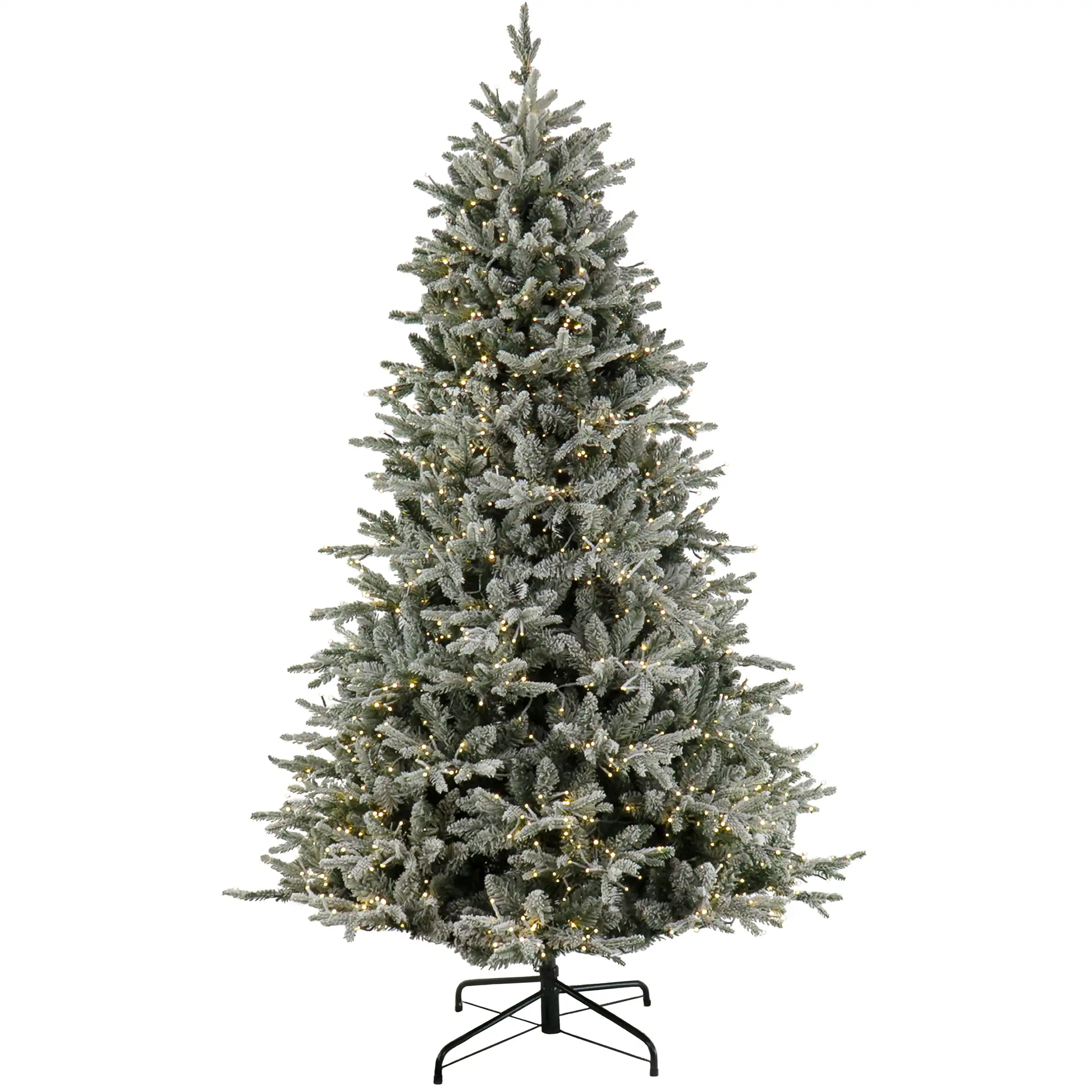 This snow-dusted tree features the PowerConnect(TM) through-the-pole lighting system that eliminates the need for connecting multiple light strings, reducing set up time. Also featured is Feel Real® branch tip technology, creating a tree with remarkable realism. It is pre-strung with 1800 LED Cosmic Lights®, which are miniature bulbs located at the tip of elongated bases for a unique design element as well as a striking increase in light volume. The integrated Dual Color® system features a choice of ten different light functions controlled by tapping the included footswitch. Three-section, hinged branch construction makes assembly quick and easy. A sturdy folding metal tree stand is included.