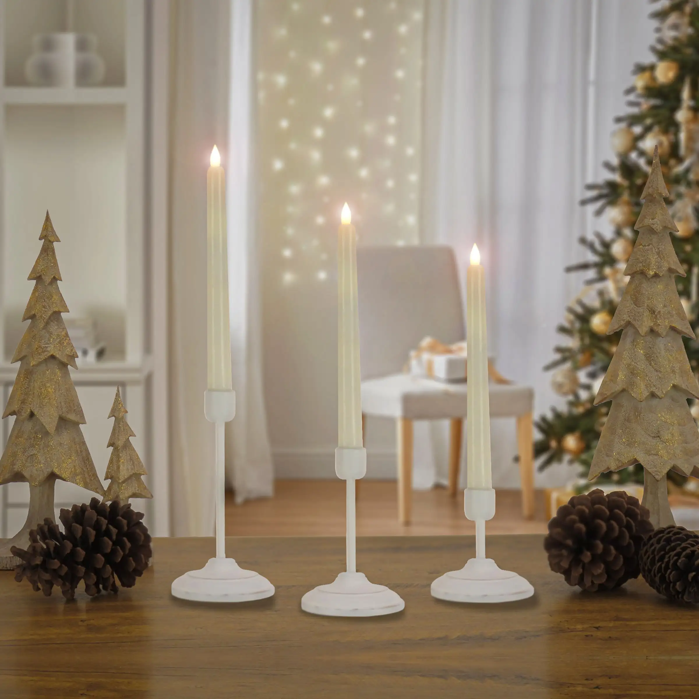Battery operated with remote controlled functions, these three flameless candles produce a realistic, soft, and safe candle glow. The smooth, ivory color candle surfaces are crafted with real wax, and each is seated in a decorative long stem candleholder constructed of wood with a whitewashed finish. A handheld remote control operates the lifelike candle flame with functions that include brightness, flicker speed, and timer settings. Set uses a total of six AAA size batteries (not included).