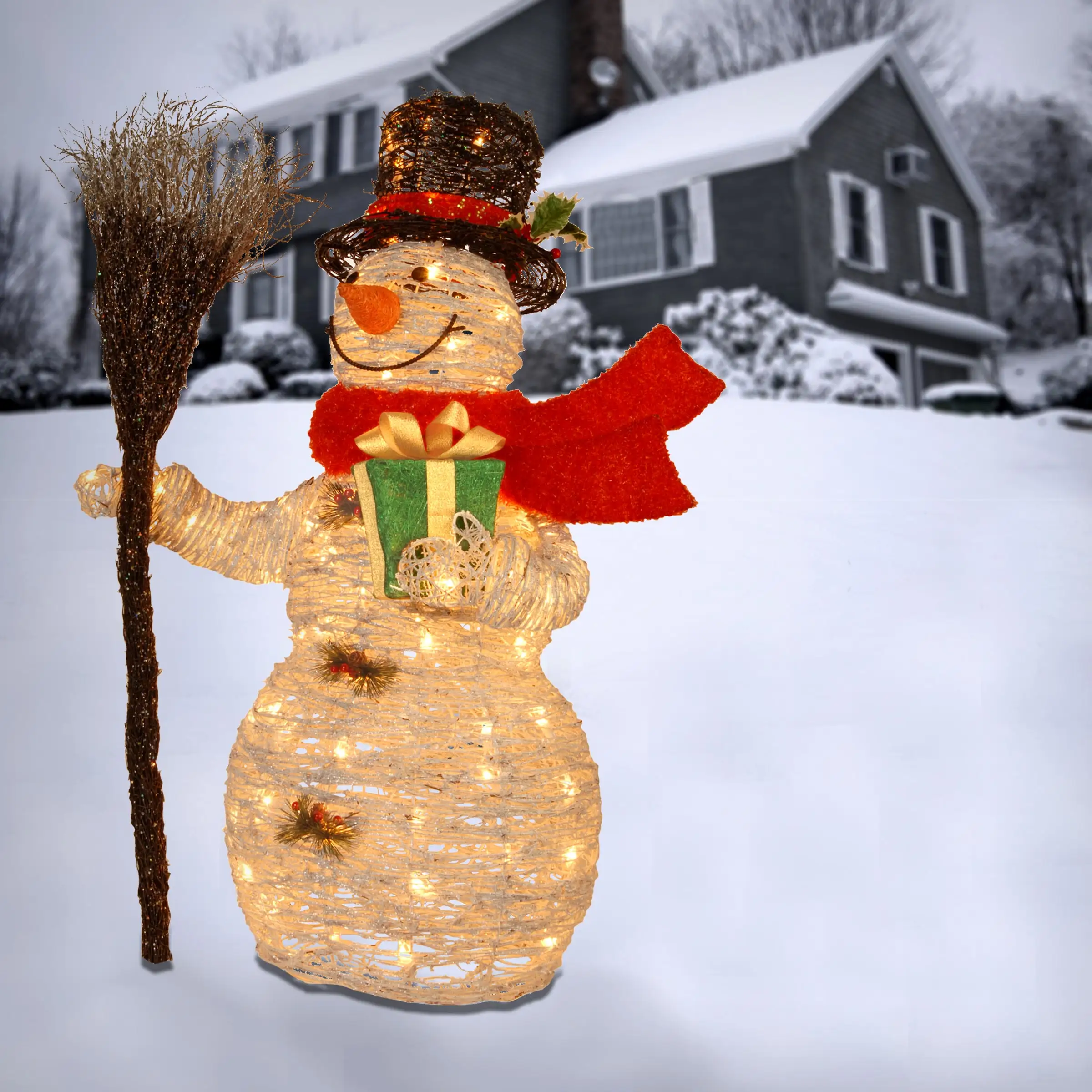 This dapper Snowman in top hat and scarf is made of rattan material sprinkled with twinkling glitter. It is lit from inside with 50 clear lights for additional sparkle. Display this holiday decoration in indoor or covered outdoor locations.