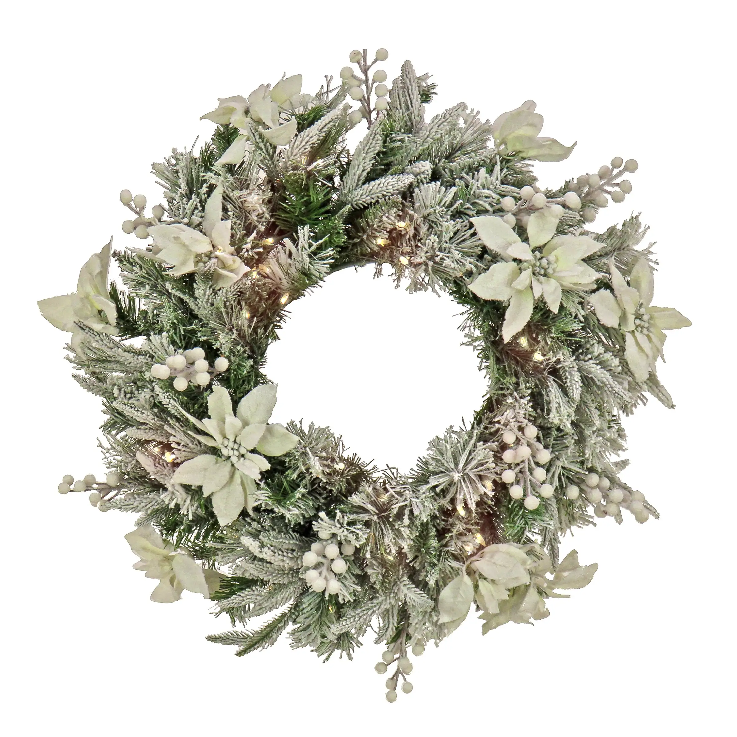 - This fantastically festive wreath features red berries and poinsettias decorating remarkably realistic branch tips strung with 70 time operated warm white LED lights