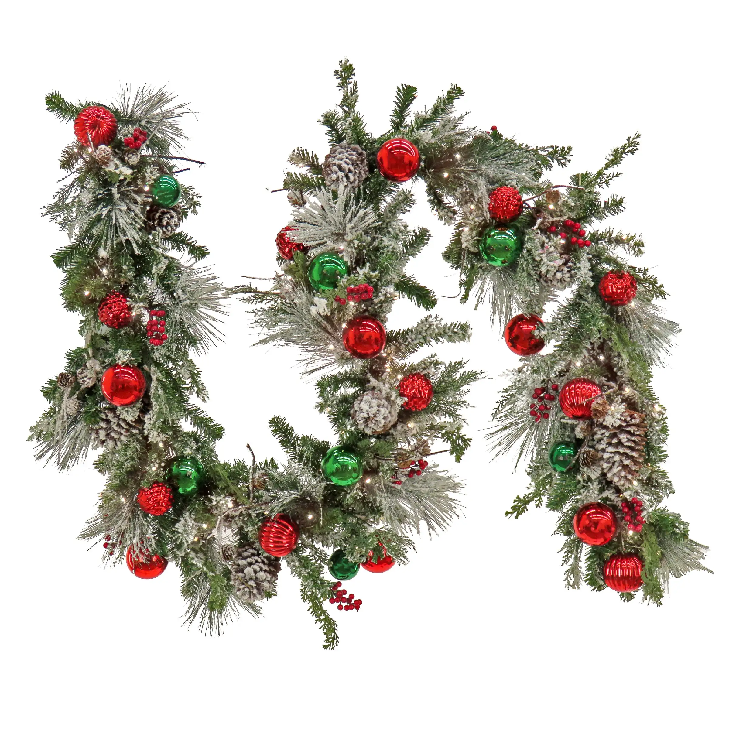 This Christmas garland features a blend of vibrant green branch tips giving a full bodied appearance and is decorated with red berry clusters, pine cones and a light artificial frosting along a General Store base. Pre strung with 100 battery operated, wa