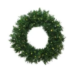 - One 20″ diameter wreath pre-lit with 50 battery-operated warm white LED lights